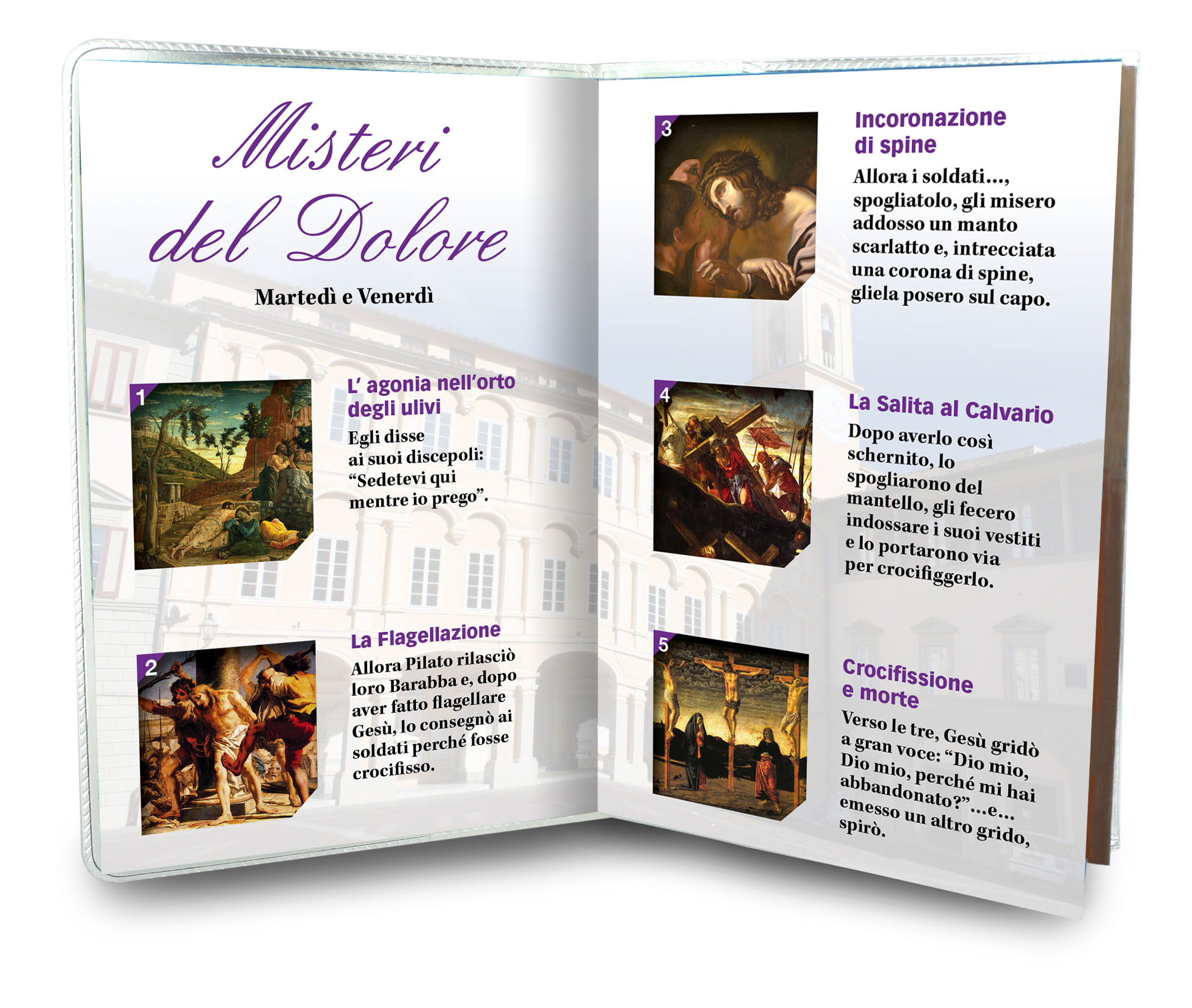 Il libretto, composto da 16 pagine, si presenta con una copertina in plastica trasparente e nell'interno vi è un piccolo rosario con i grani tipo perlina del diamero di mm 4.