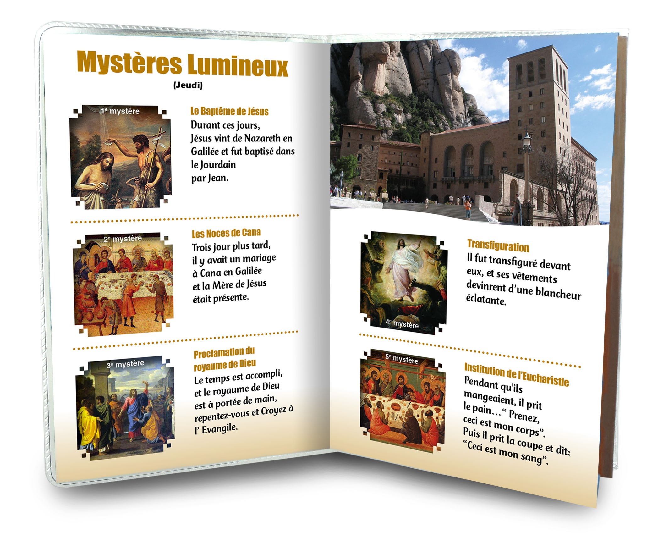 Il libretto, composto da 16 pagine, si presenta con una copertina in plastica trasparente e nell'interno vi è un piccolo rosario con i grani tipo perlina del diamero di mm 4.