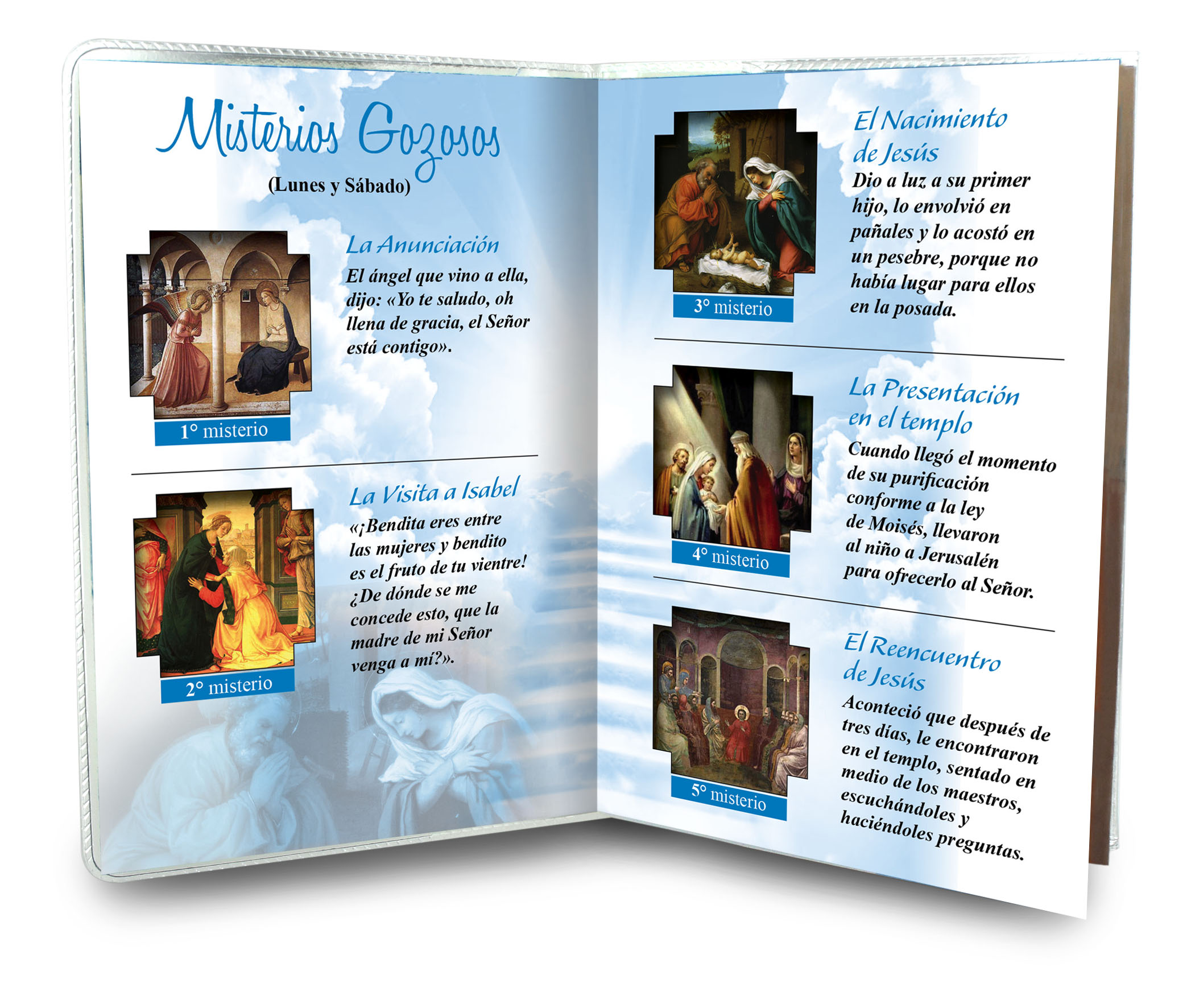 Il libretto, composto da 16 pagine, si presenta con una copertina in plastica trasparente e nell'interno vi è un piccolo rosario con i grani tipo perlina del diamero di mm 4.