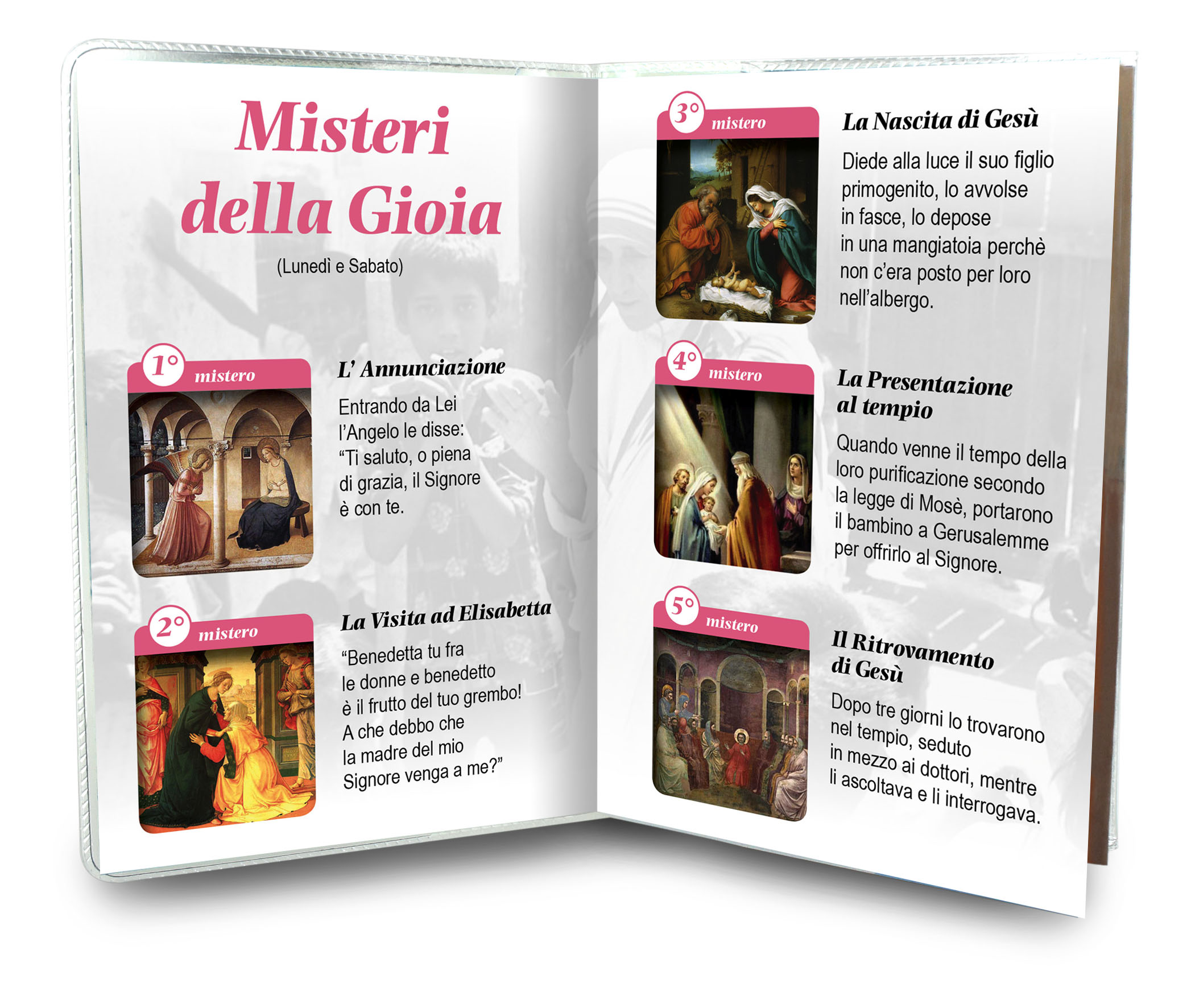 Il libretto, composto da 20 pagine, si presenta con una copertina in plastica trasparente e nell'interno vi è un piccolo rosario con i grani tipo perlina del diamero di mm 4.