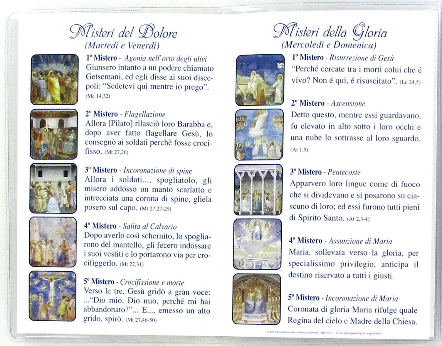 Il libretto, composto da 8 pagine, si presenta con una copertina in plastica trasparente e nell'interno vi è un piccolo rosario con i grani tipo perlina del diamero di mm 4.