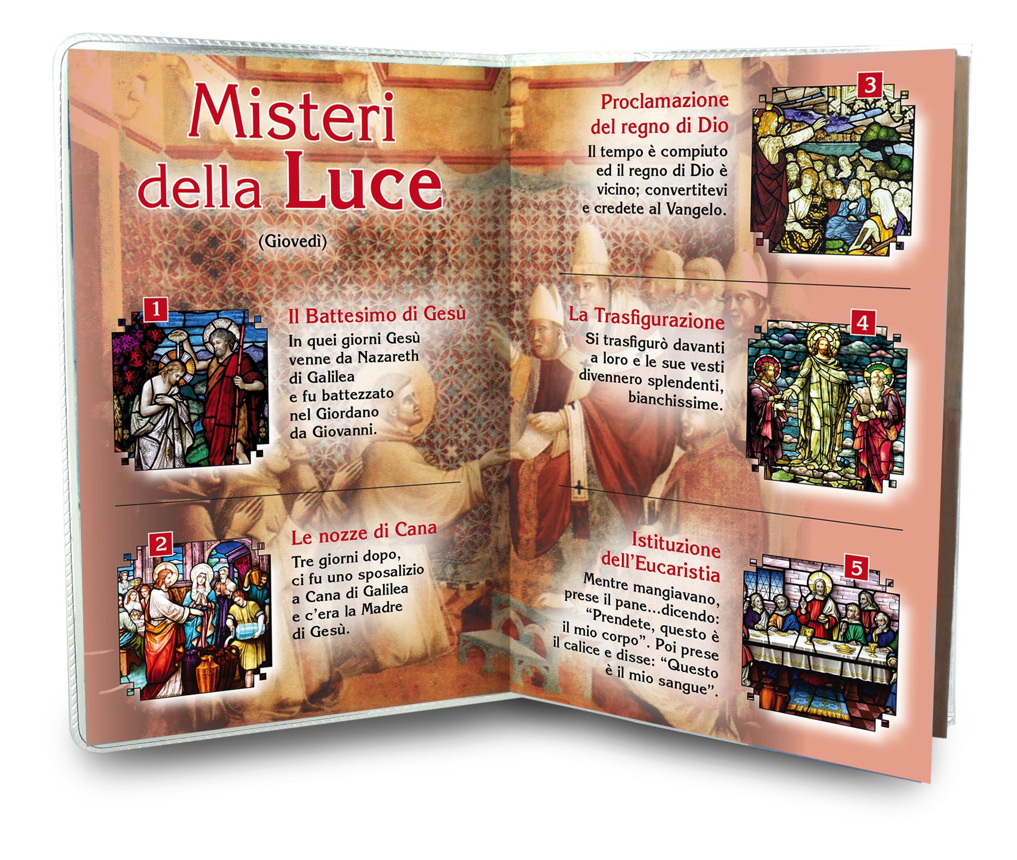 Il libretto, composto da 16 pagine, si presenta con una copertina in plastica trasparente e nell'interno vi è un piccolo rosario con i grani tipo perlina del diamero di mm 4.