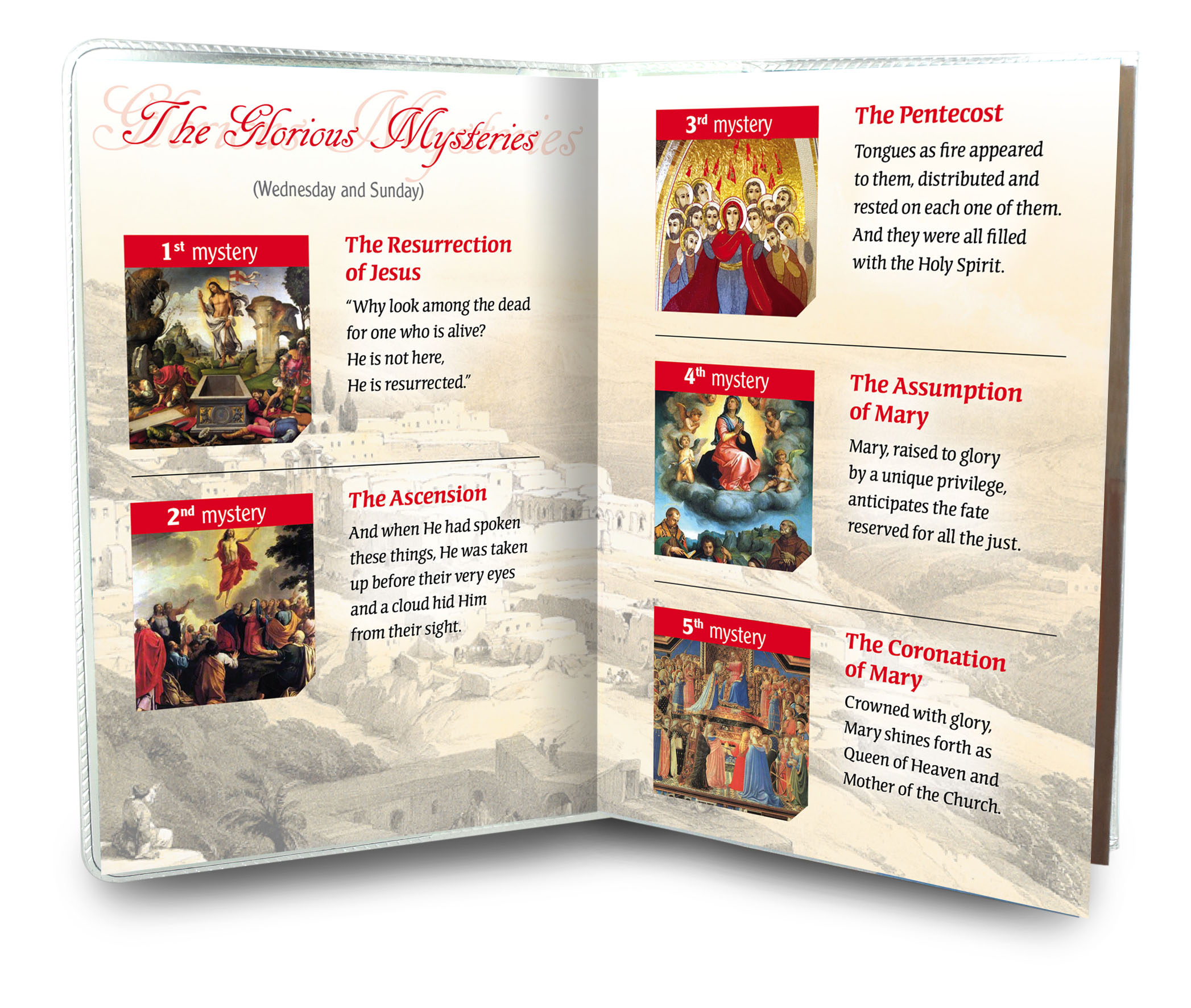 Il libretto, composto da 16 pagine, si presenta con una copertina in plastica trasparente e nell'interno vi è un piccolo rosario con i grani tipo perlina del diamero di mm 4.