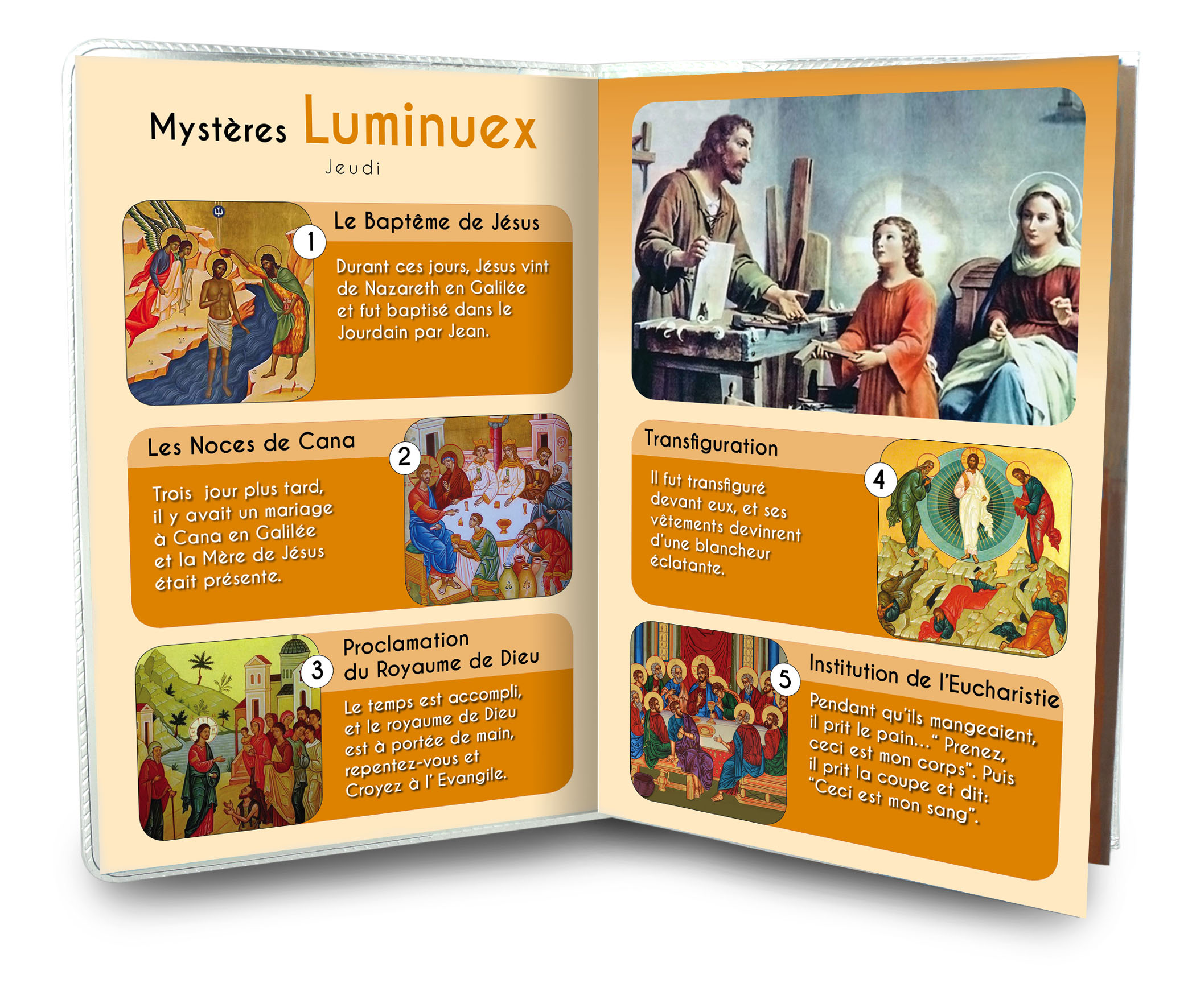 Il libretto, composto da 16 pagine, si presenta con una copertina in plastica trasparente e nell'interno vi è un piccolo rosario con i grani tipo perlina del diamero di mm 4.