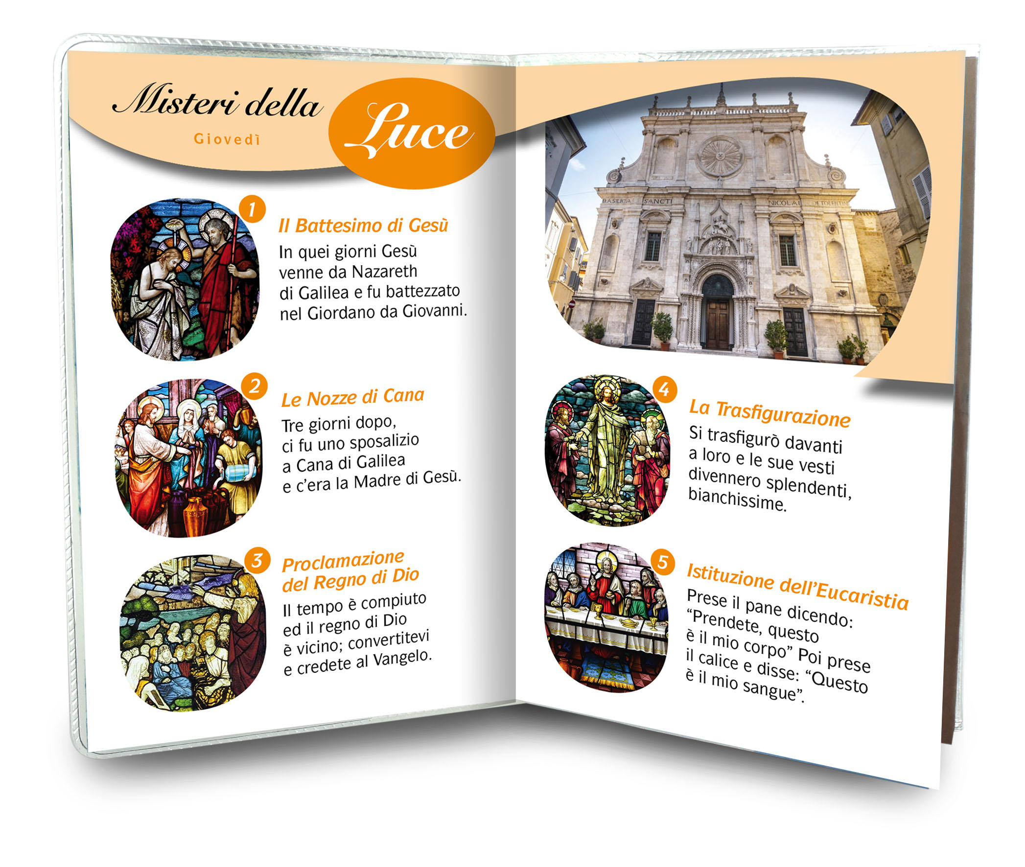Il libretto, composto da 16 pagine, si presenta con una copertina in plastica trasparente e nell'interno vi è un piccolo rosario con i grani tipo perlina del diamero di mm 4.