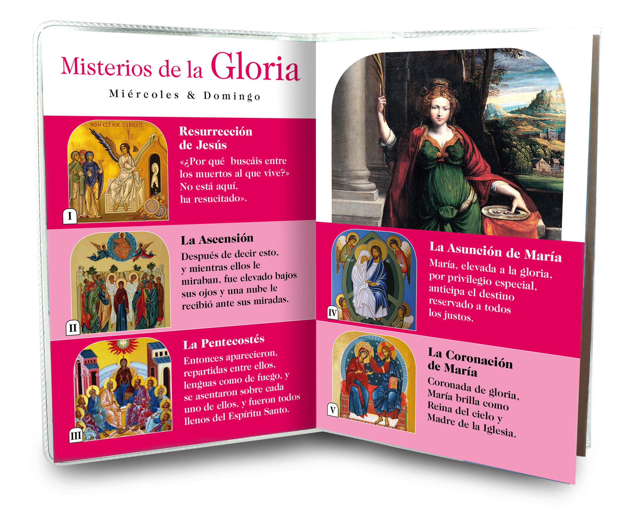 Il libretto, composto da 16 pagine, si presenta con una copertina in plastica trasparente e nell'interno vi è un piccolo rosario con i grani tipo perlina del diamero di mm 4.