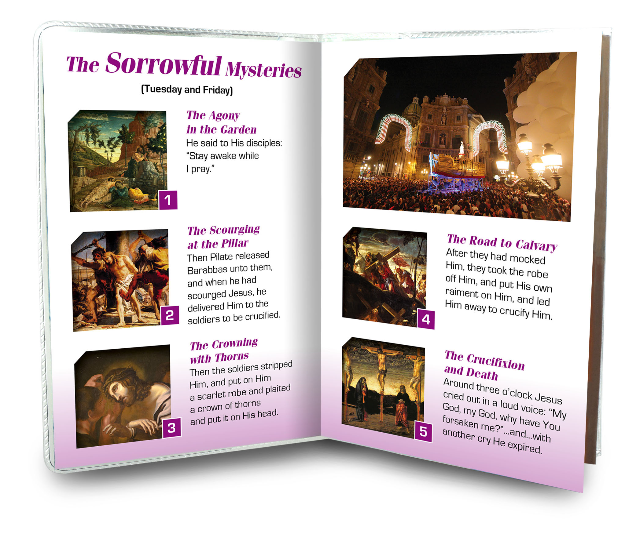 Il libretto, composto da 16 pagine, si presenta con una copertina in plastica trasparente e nell'interno vi è un piccolo rosario con i grani tipo perlina del diamero di mm 4.