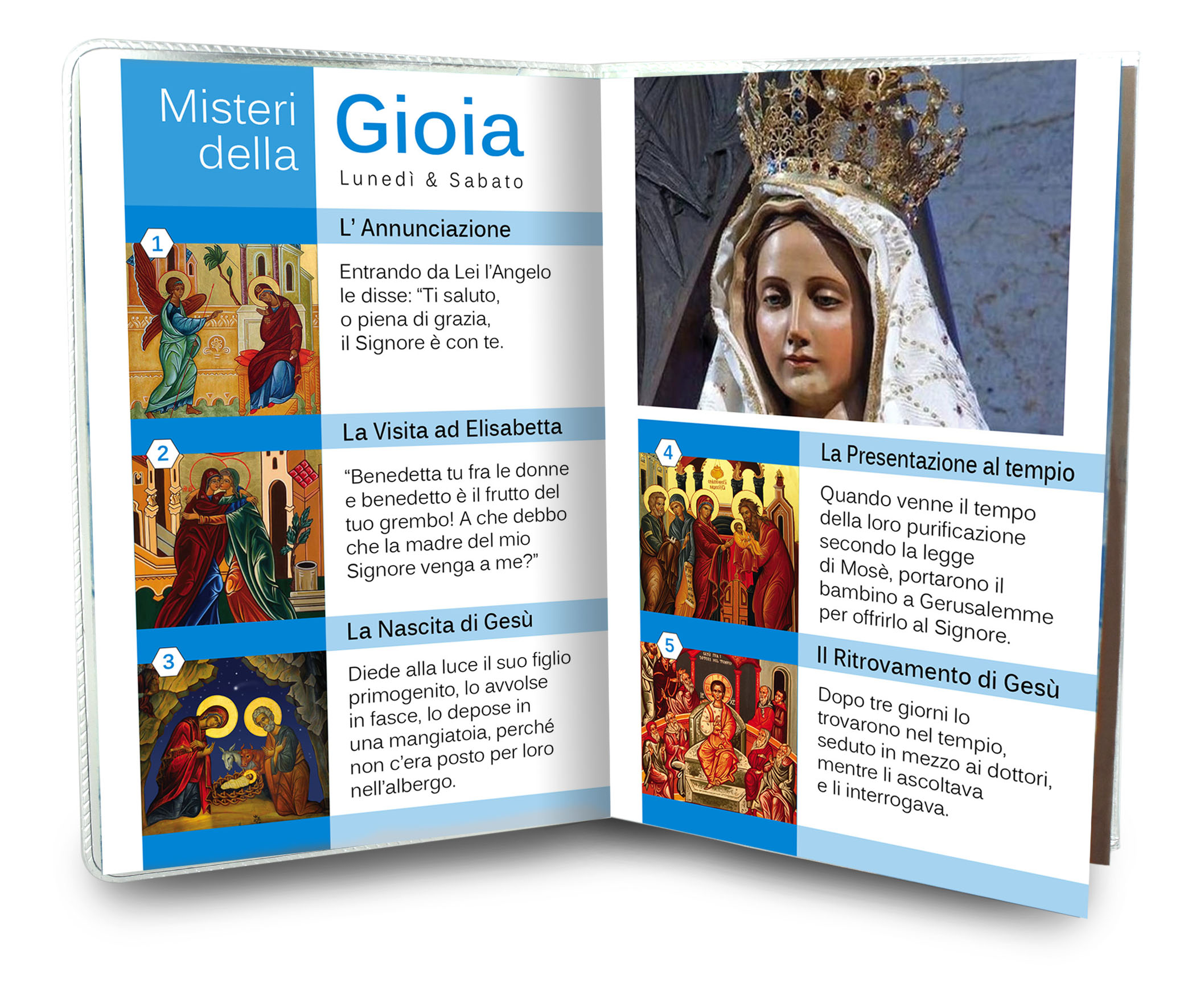 Il libretto, composto da 16 pagine, si presenta con una copertina in plastica trasparente e nell'interno vi è un piccolo rosario con i grani tipo perlina del diamero di mm 4.