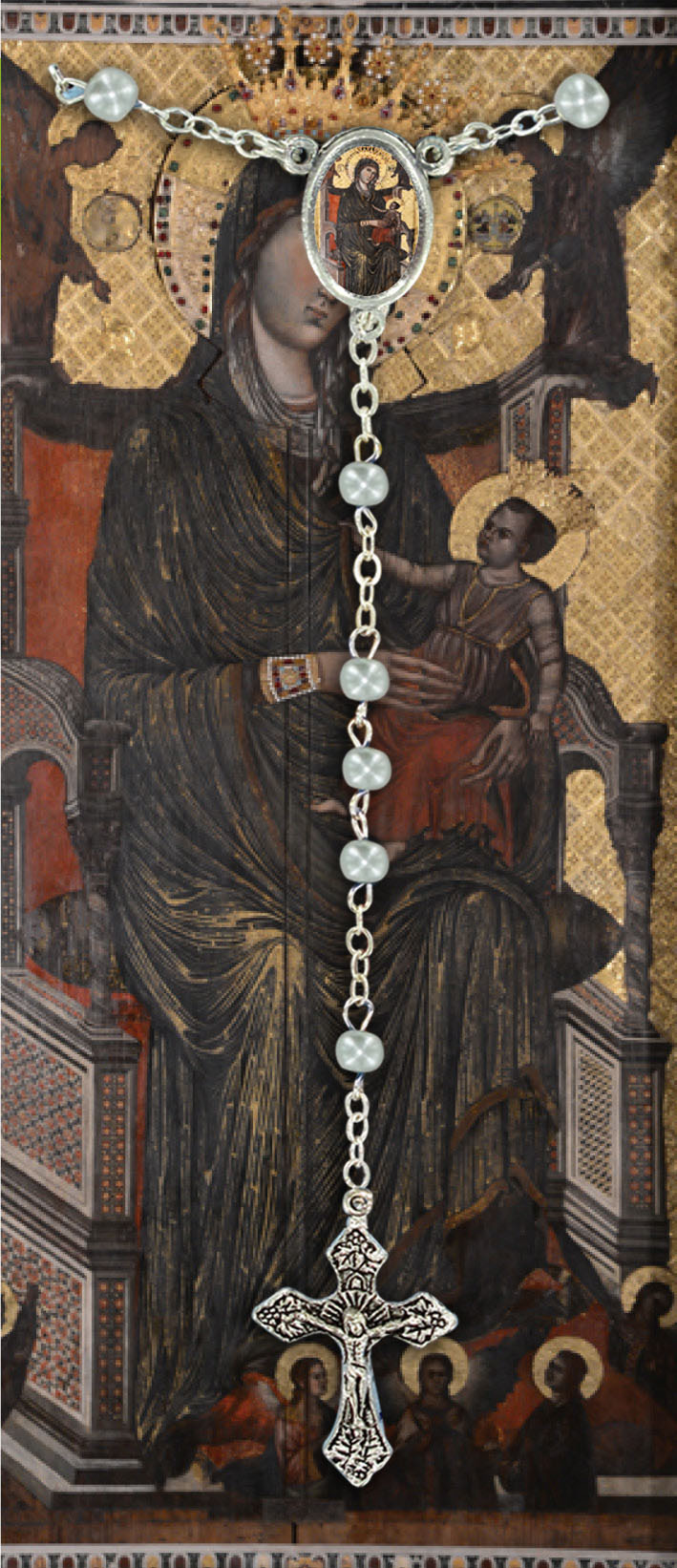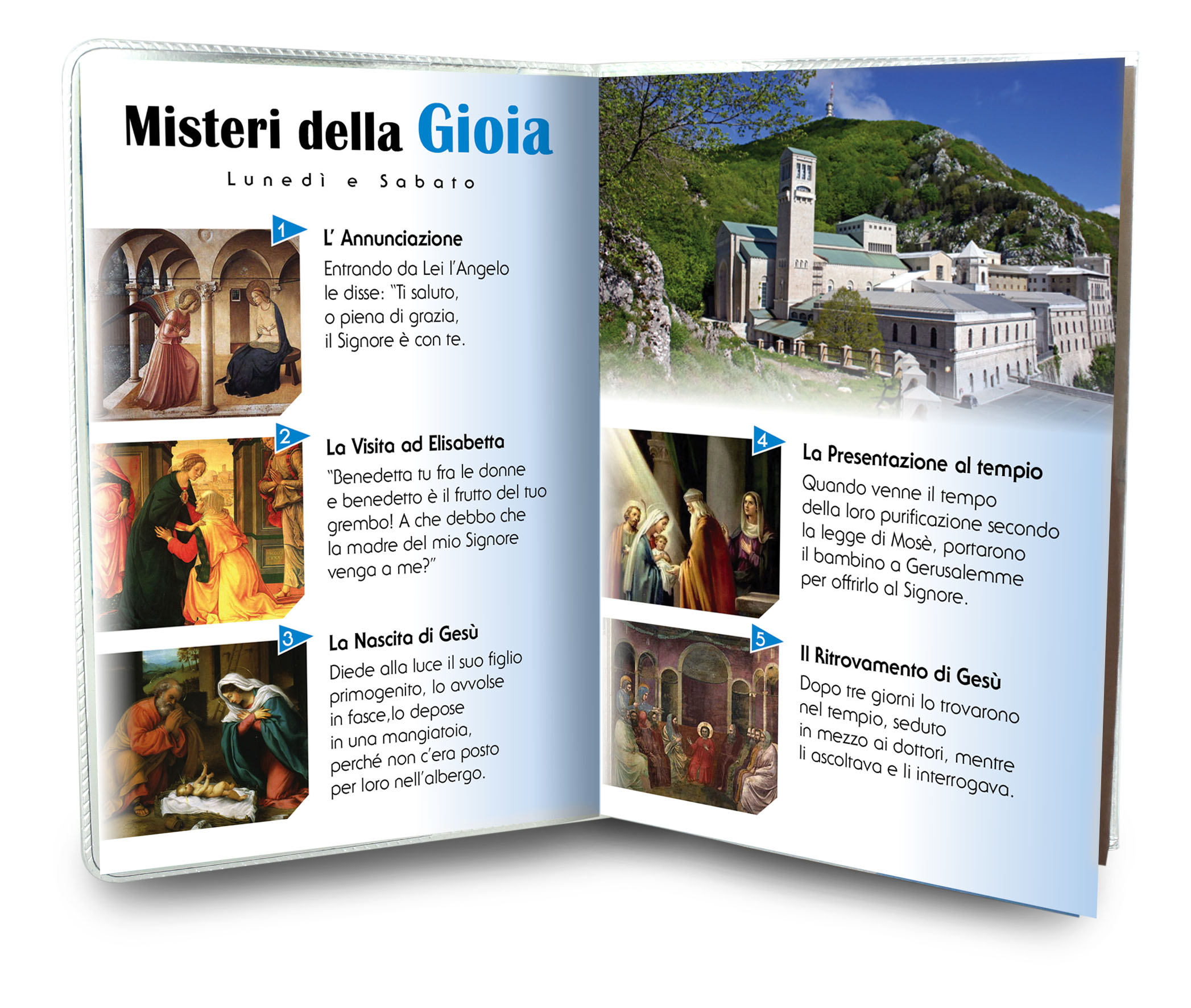 Il libretto, composto da 16 pagine, si presenta con una copertina in plastica trasparente e nell'interno vi è un piccolo rosario con i grani tipo perlina del diamero di mm 4.