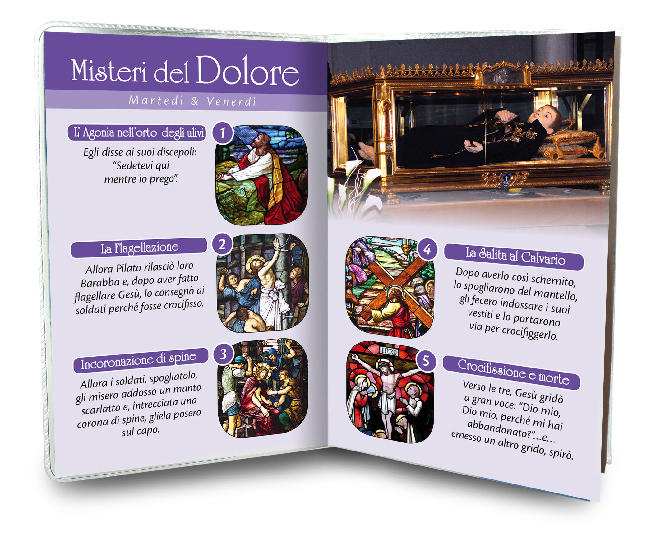 Il libretto, composto da 16 pagine, si presenta con una copertina in plastica trasparente e nell'interno vi è un piccolo rosario con i grani tipo perlina del diamero di mm 4.