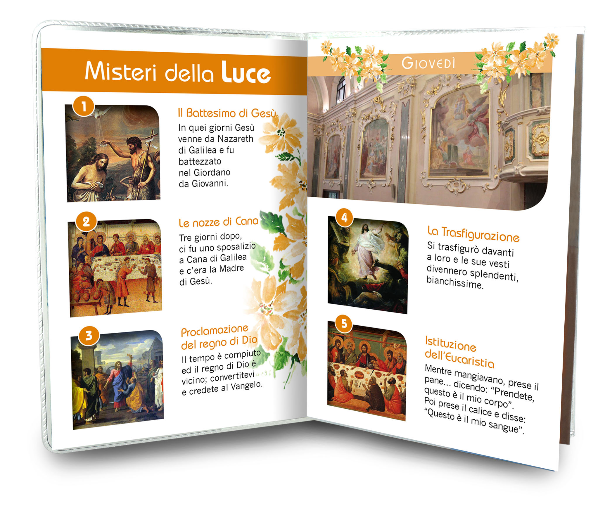 Il libretto, composto da 16 pagine, si presenta con una copertina in plastica trasparente e nell'interno vi è un piccolo rosario con i grani tipo perlina del diamero di mm 4.