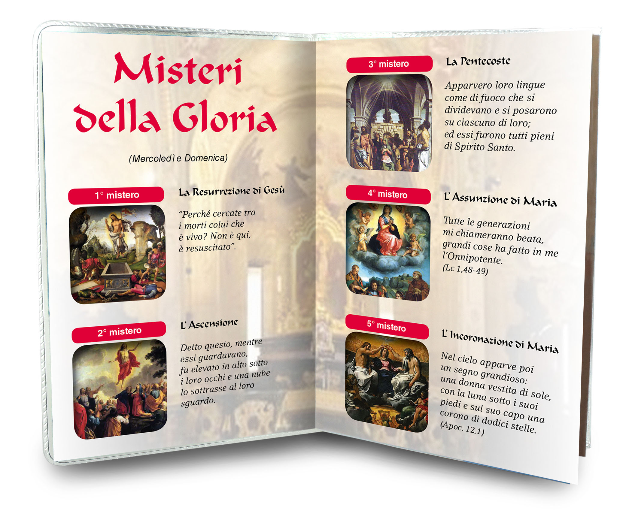 Il libretto, composto da 16 pagine, si presenta con una copertina in plastica trasparente e nell'interno vi è un piccolo rosario con i grani tipo perlina del diamero di mm 4.