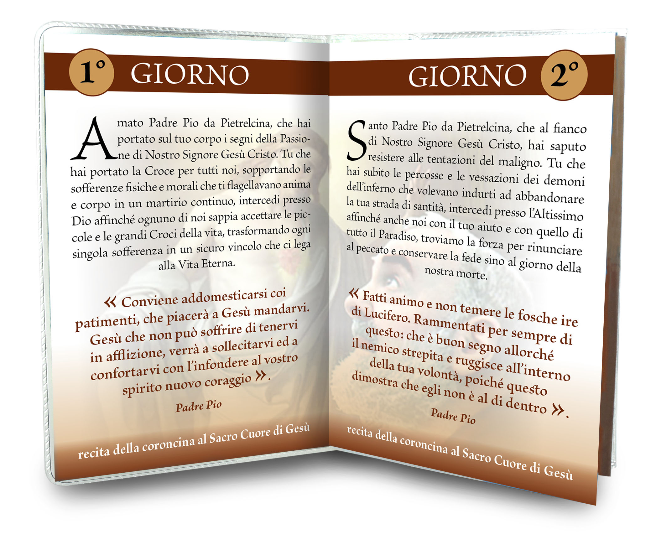 Nell'interno vi sono le invocazioni della Novena a San Pio da Pietrelcina e la preghiera della Coroncina al Sacro Cuore di Gesù.