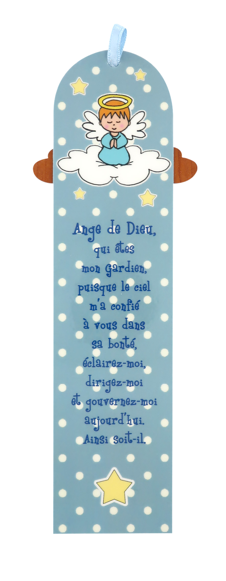 Segnalibro a forma di cupola con fiocchetto azzurro e immagine dell'angelo custode e preghiera in francese.