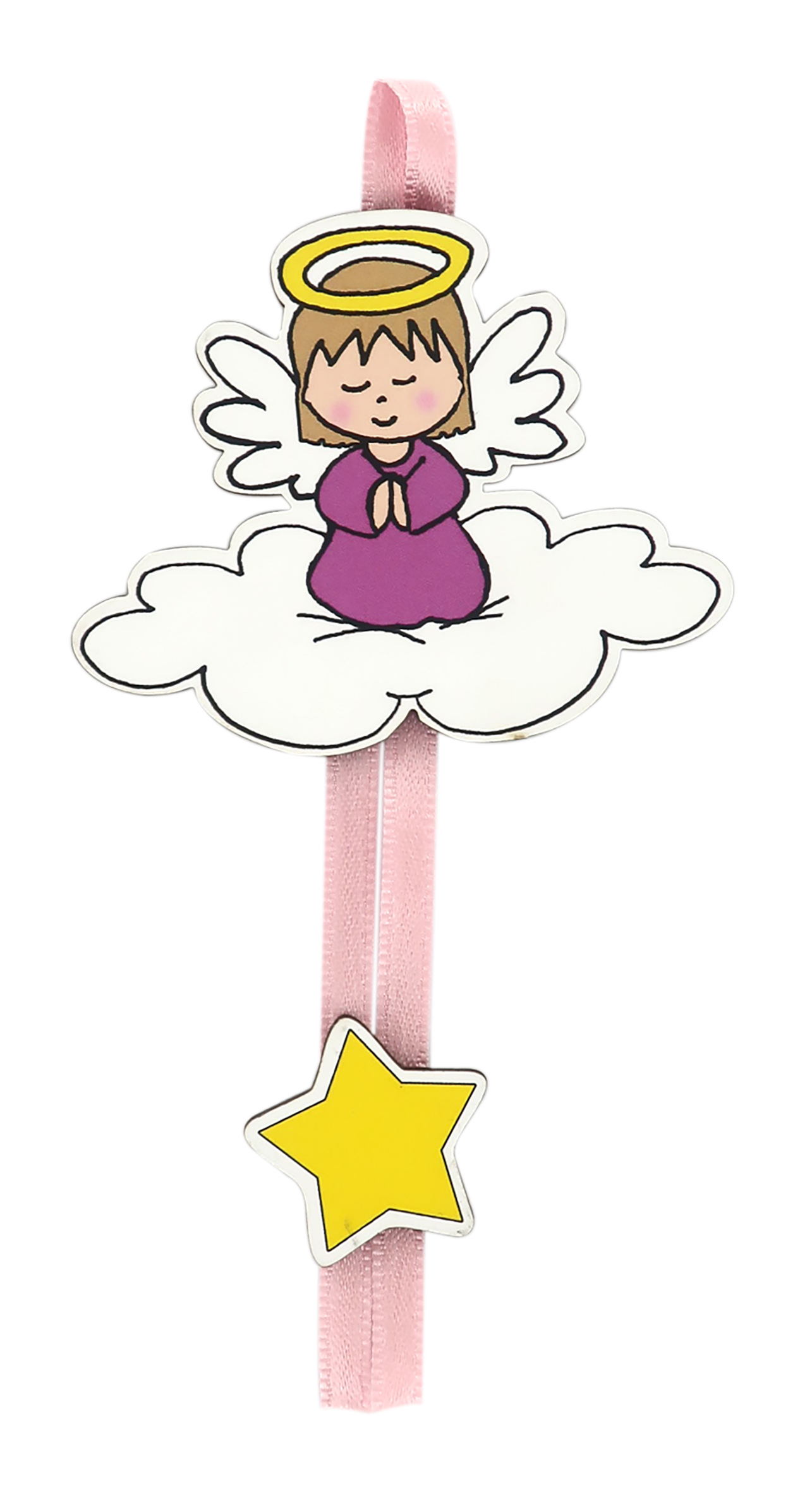 Segnalibro a forma di cupola con fiocchetto rosa e immagine dell'angelo custode.