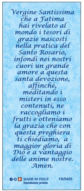 Segnalibro calamitato con l'immagine della Madonna di Fatima e con una preghiera.