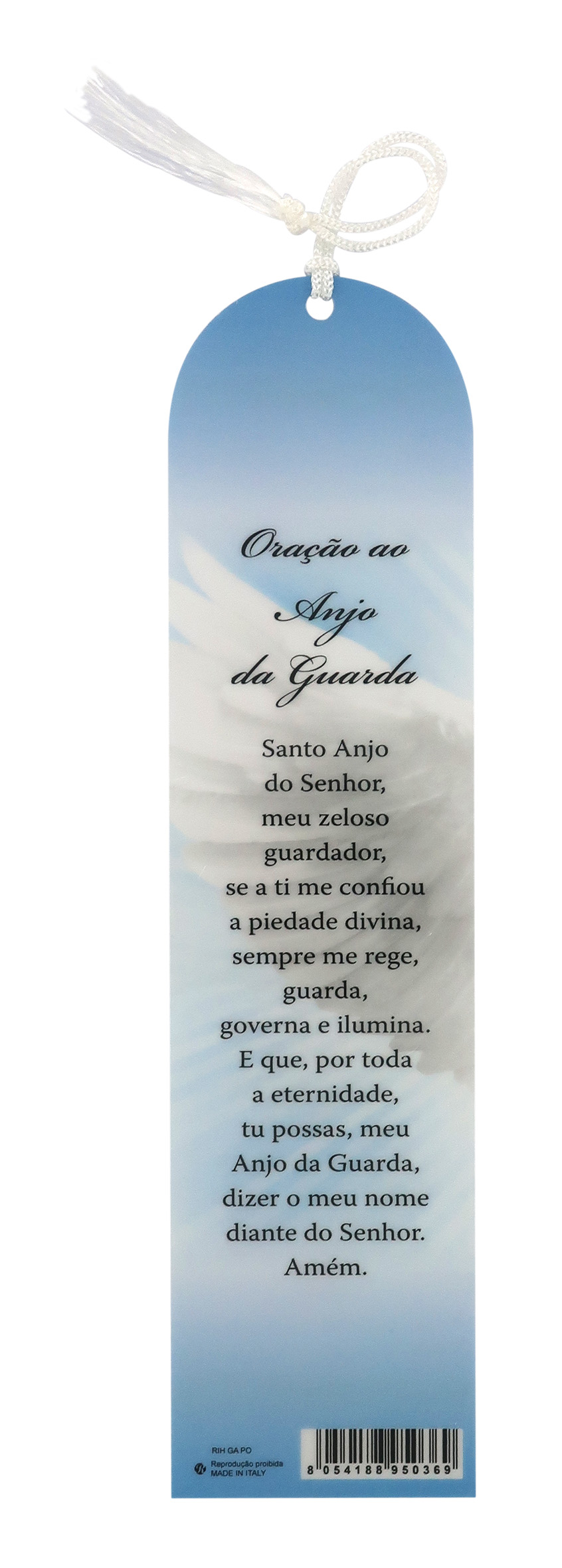 Segnalibro con parte superiore a forma di cupola, dedicato alla figura dell'Angelo Custode ("Anjo da guarda" in portoghese) con nappina di colore bianco. La parte frontale reca un'immagine in cui una coppia di bambini viene protetta da un grande Angelo di Dio alato, mentre il retro offre una preghiera in portoghese.