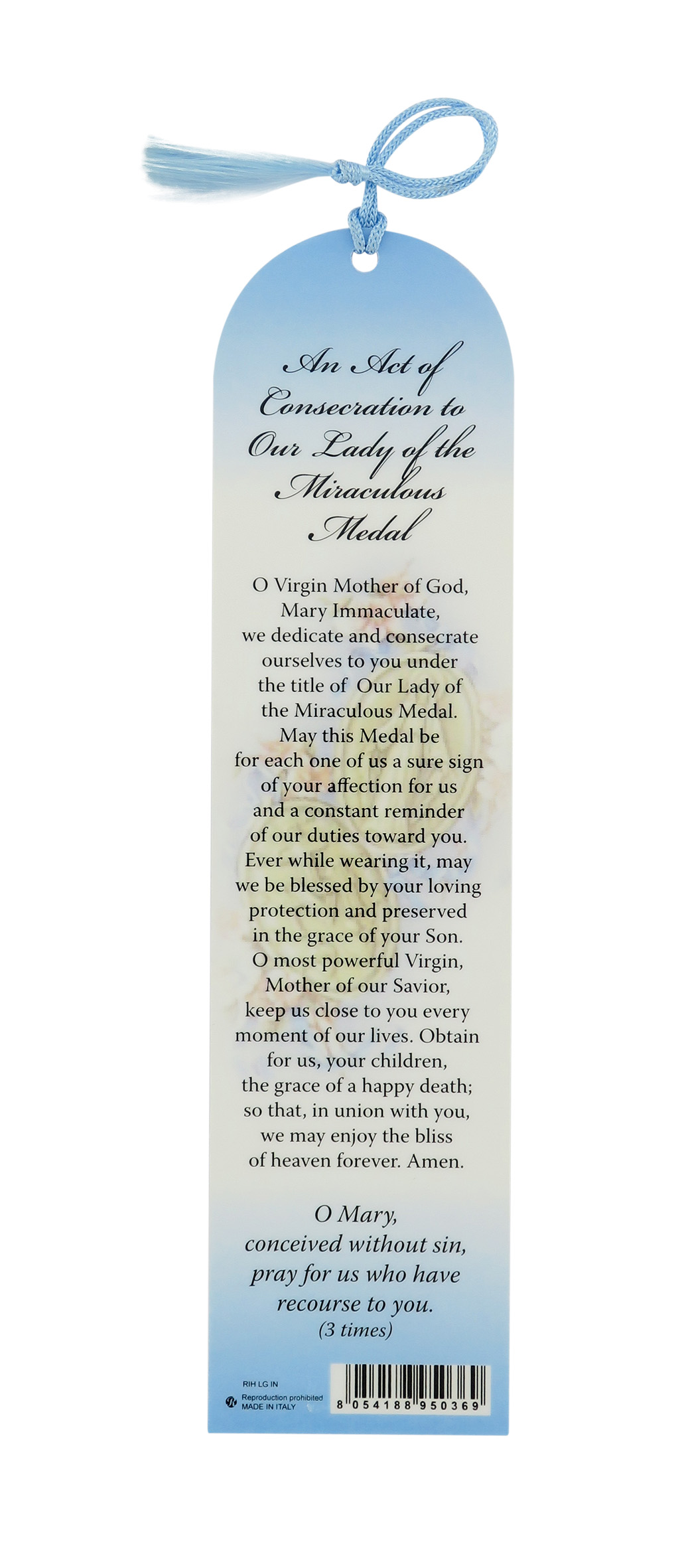 Segnalibro con parte superiore a forma di cupola, dedicato alla Madonna Miracolosa, con nappina di colore azzurro. La parte frontale reca l'immagine di Nostra Signora della Medaglia Miracolosa, (inglese: "Our Lady of Grace"), mentre il retro offre una preghiera in inglese.