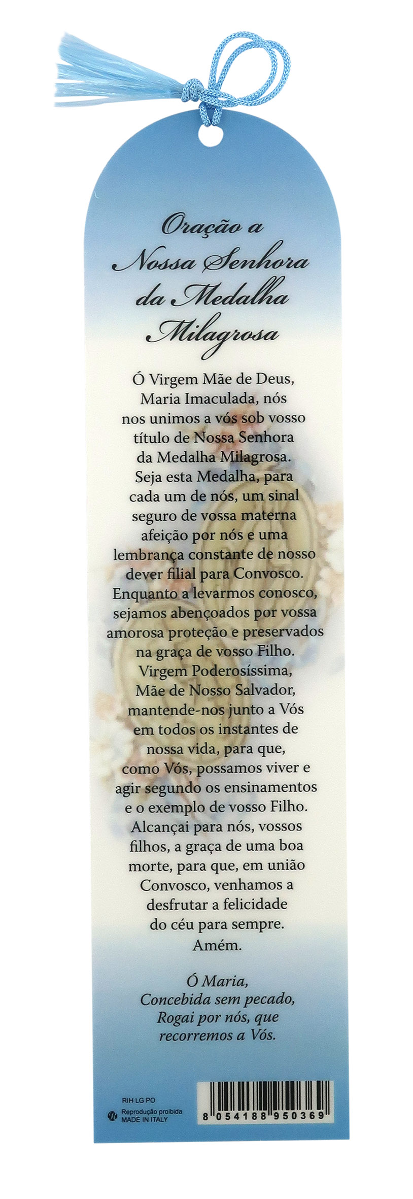 Segnalibro con parte superiore a forma di cupola, dedicato alla Madonna Miracolosa, (in portoghese: "Nossa Senhora da Medalha Milagrosa") con nappina di colore azzurro. La parte frontale reca l'immagine di Nostra Signora della Medaglia Miracolosa, mentre il retro offre una preghiera in portoghese.