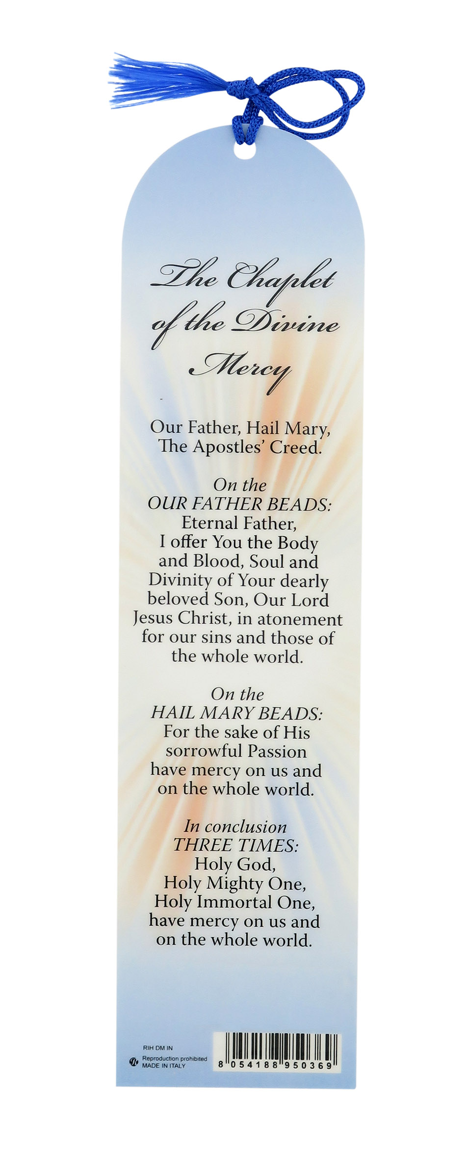 Segnalibro con parte superiore a forma di cupola, dedicato a Gesù Misericordioso (in inglese: Divine Mercy), con nappina di colore blu. La parte frontale reca un'immagine di Gesù, dal cui petto s'irradiano raggi color blu e rossi, simbolo del sangue e dell'acqua. Il retro offre una preghiera in inglese.