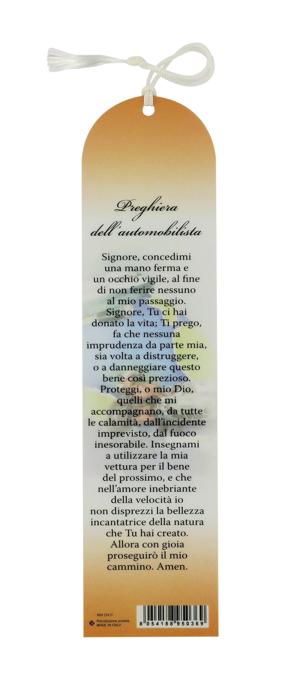 Segnalibro con parte superiore a forma di cupola, dedicato alla figura di San Cristoforo, con nappina di colore bianco. La parte frontale reca un'immagine di S. Cristoforo come da iconografia: il santo guada un fiume aiutando il Bambino, trasportato sulle spalle, ad attraversare un corso d'acqua. Il retro offre una preghiera in italiano.