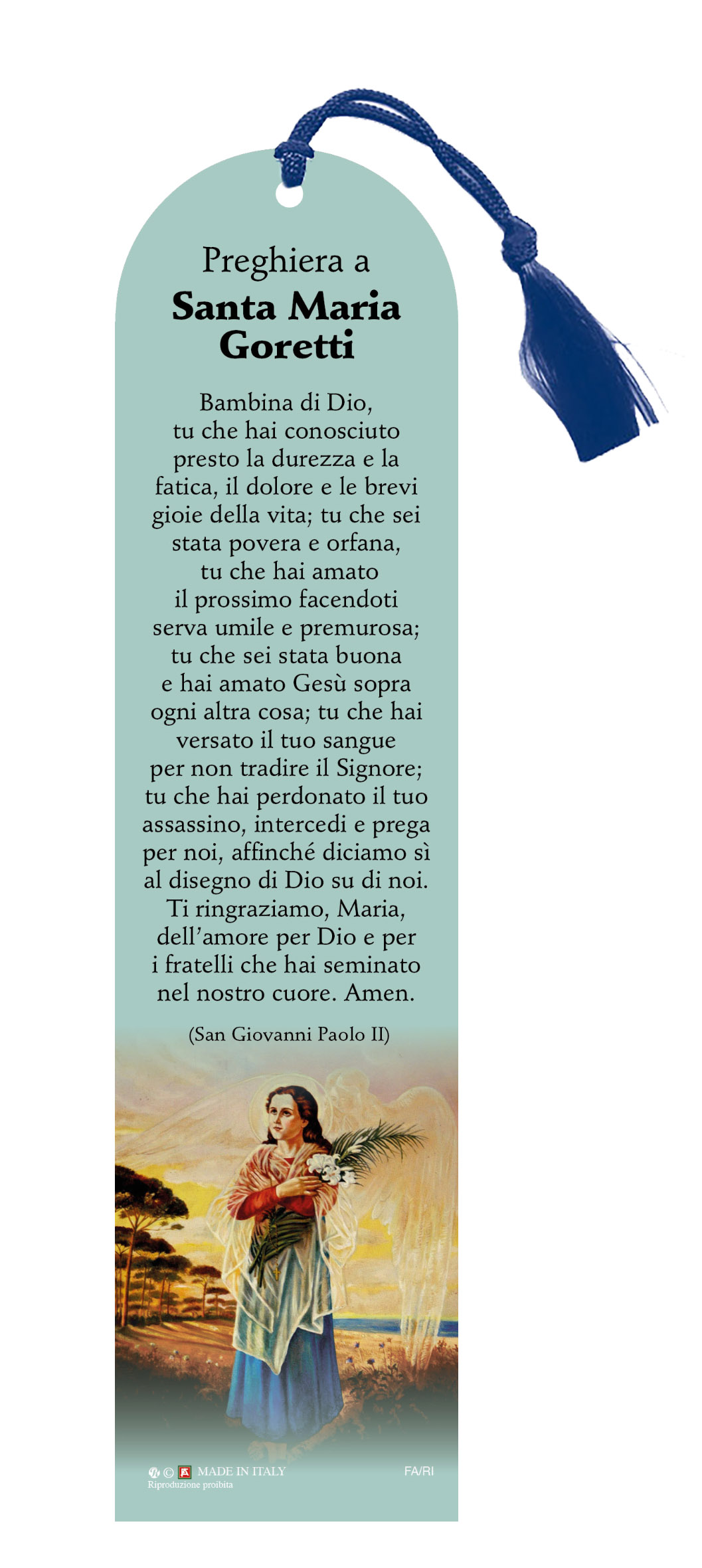 Segnalibro in carta plastificata, con parte superiore a forma di cupola e nappina blu, dedicato a Santa Maria Goretti. La parte frontale reca un'immagine della santa, mentre il retro offre una preghiera in italiano.
