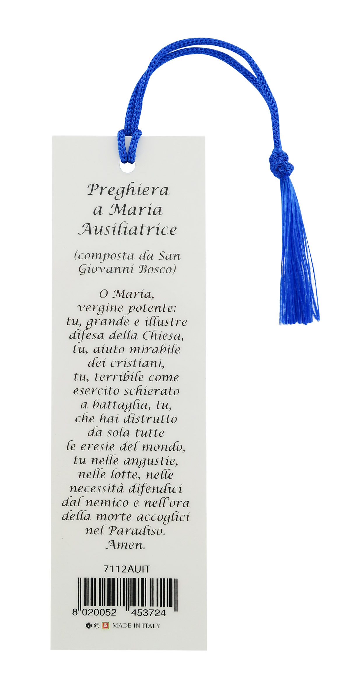 Segnalibro rettangolare in cartoncino plastificato con l'immagine della Madonna Ausiliatrice e sul retro una preghiera a lei dedicata.