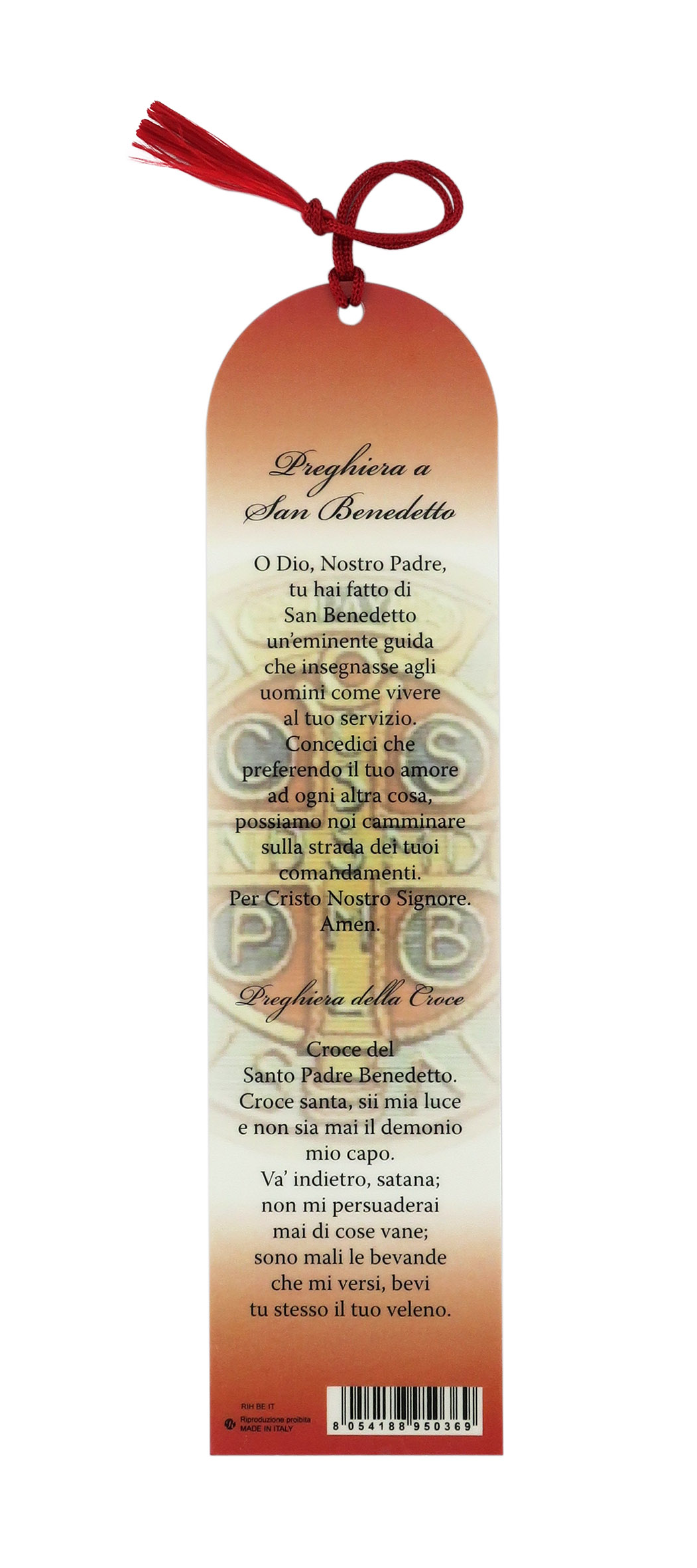 Segnalibro a forma di cupola con fiocchetto rosso e immagine di San Benedetto.