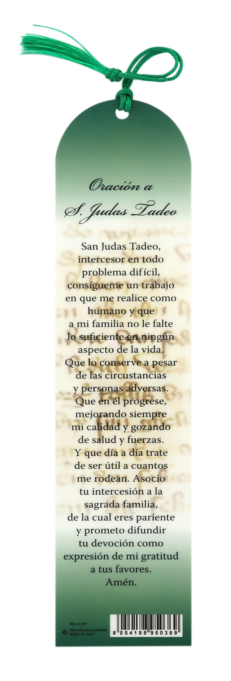 Segnalibro San Giuda Taddeo a forma di cupola con fiocchetto verde - 5,5 x 22,5 cm - spagnolo