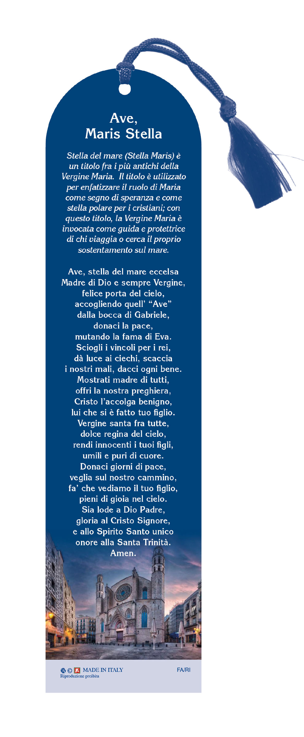 Segnalibro a forma di cupola con fiocchetto, raffigurante Santa Maria del Mar con prehiera in italiano.