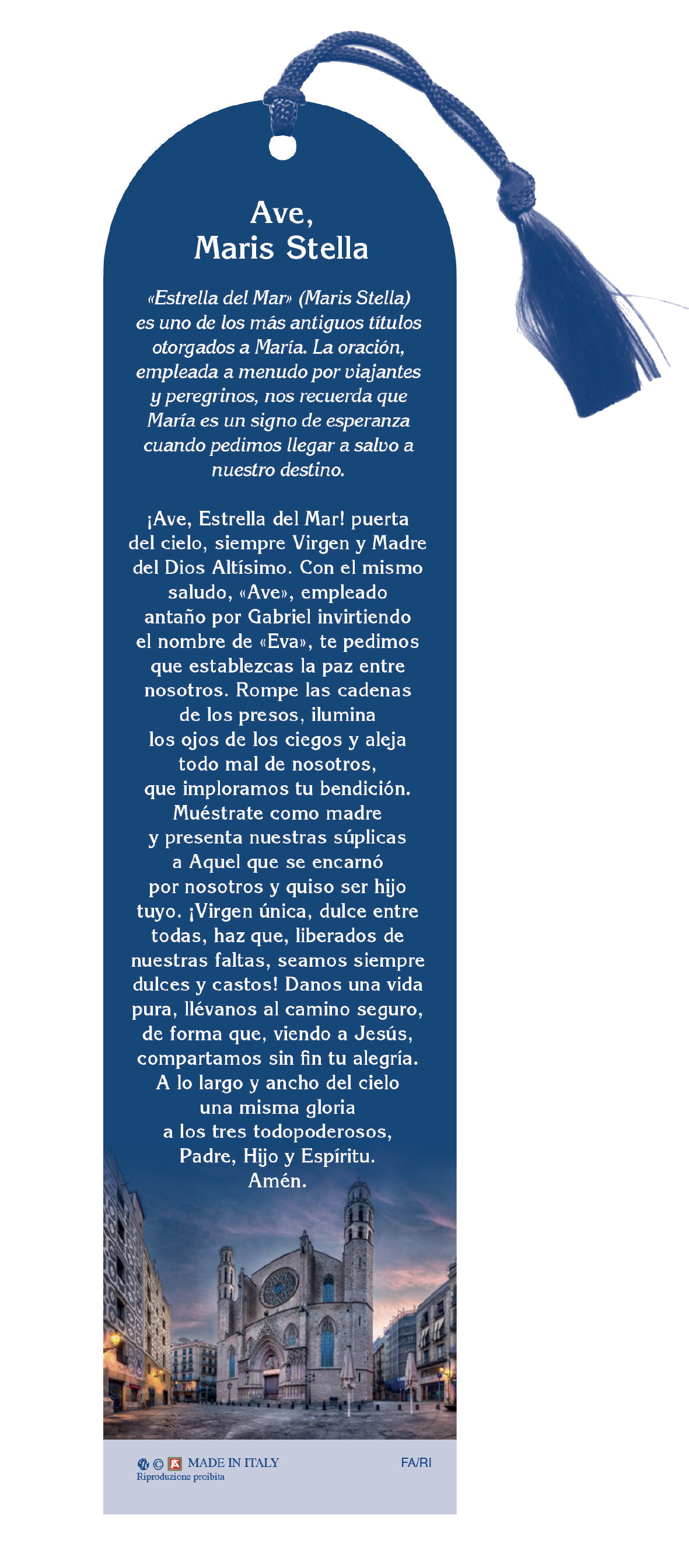 Segnalibro a forma di cupola con fiocchetto, raffigurante Santa Maria del Mar con prehiera in spagnolo.