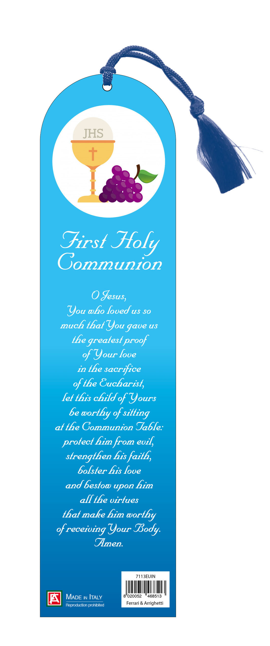 Segnalibro a forma di cupola con fiocchetto, raffigurante i simboli della comunione con prehiera in inglese.