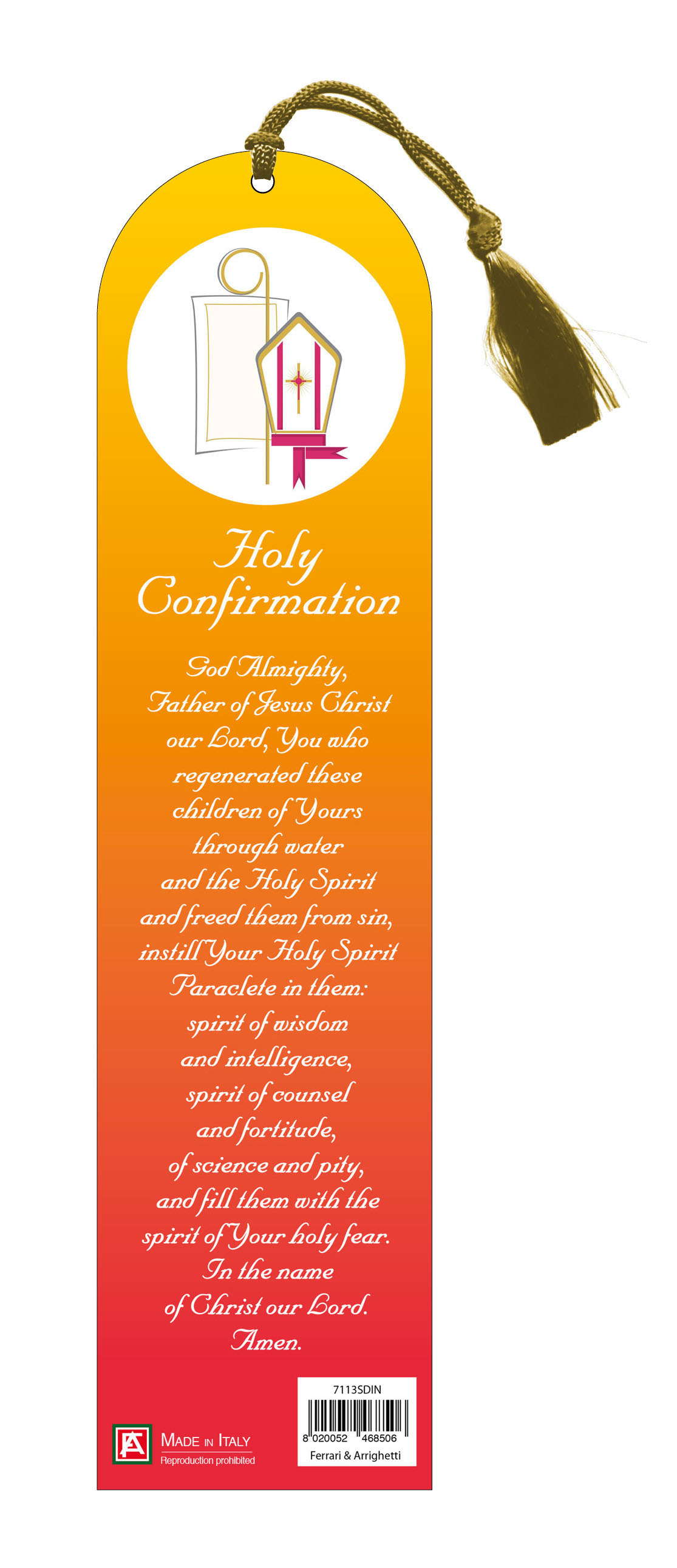 Segnalibro a forma di cupola con fiocchetto, raffigurante i simboli della cresima con prehiera in inglese.