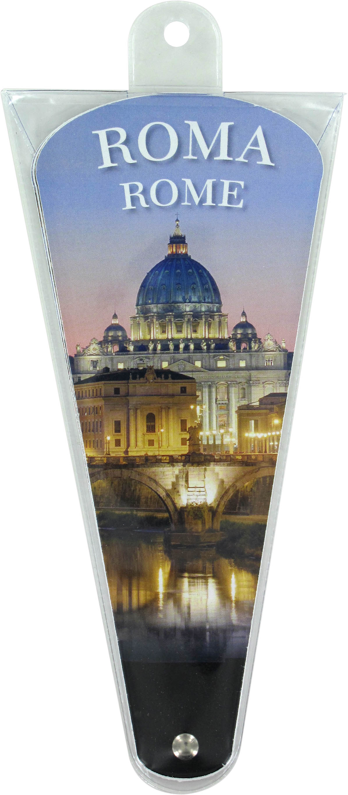 Il ventaglio è composto da 5 petali in cartoncino pesante con immagini legate alla storia di Roma. L'altezza è di 17,5 cm. Realizzato in Italia.