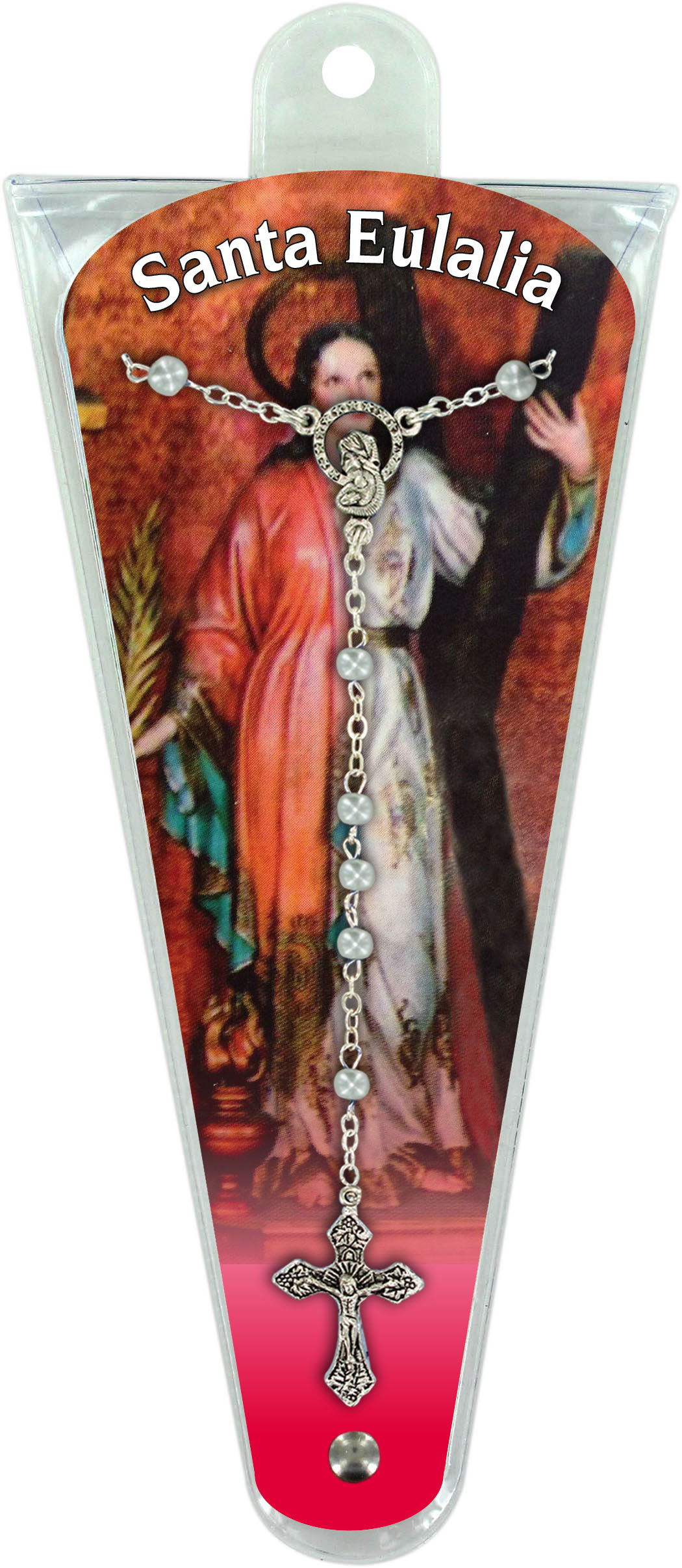 Sul primo e sull'ultimo petalo è stampata l'immagine di Sant Eulalia mentre sugli altri due sono stampati i misteri del rosario in spagnolo. Altezza pari a 17,5 cm.