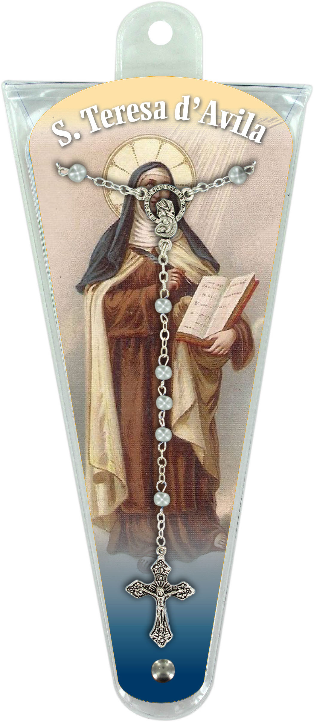 Sul primo e sull'ultimo petalo è stampata l'immagine di Santa Teresa d'Avila mentre sugli altri due sono stampati i misteri del rosario in italiano. Altezza pari a 17,5 cm.