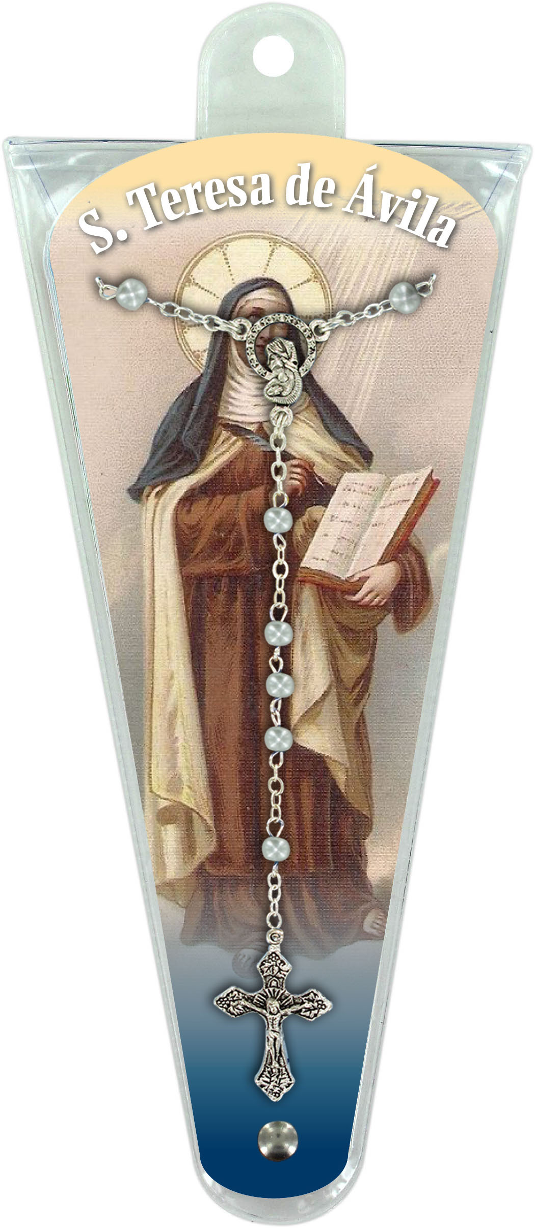 Sul primo e sull'ultimo petalo è stampata l'immagine di Santa Teresa d'Avila mentre sugli altri due sono stampati i misteri del rosario in spagnolo. Altezza pari a 17,5 cm.