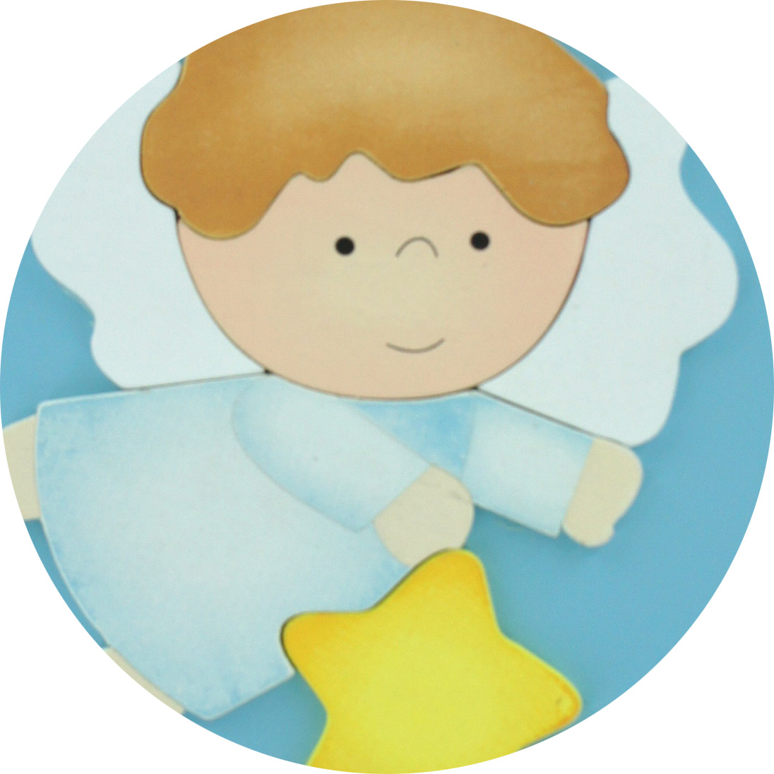 Pala in legno di colore azzurro con forma tonda raffigurante l'Angelo con la stellina. Regalo ideale per la cameretta dei bambini. Sul retro vi è un comodo ma semplice gancio per poter essere appesa al muro. Il prodotto misura un diametro pari a cm 16. La collezione di quadretti colorati per bambini Ferrari & Arrighetti vanta una vasta palette di colori e fantasie, adatti a bambini e a bambine. La maggior parte dei quadretti riporta anche una preghiera, come l'Angelo di Dio o l'Ave Maria, in modo che il fortunato destinatario di questa idea regalo possa usare il quadretto per memorizzare le preghiere e impararle in modo divertente. I colori accesi e le illustrazioni aiutano a catturare l'attenzione del bambino e faranno sicuramente un figurone nella stanzetta dei bimbi. Il legno MDF (Medium Density Fiberboard) è un materiale versatile composto da fibre di legno pressate, ideale per tavolette illustrate. La sua superficie uniforme permette una ottima resa dei colori e dei dettagli. La stabilità dimensionale evita deformazioni nel tempo.
