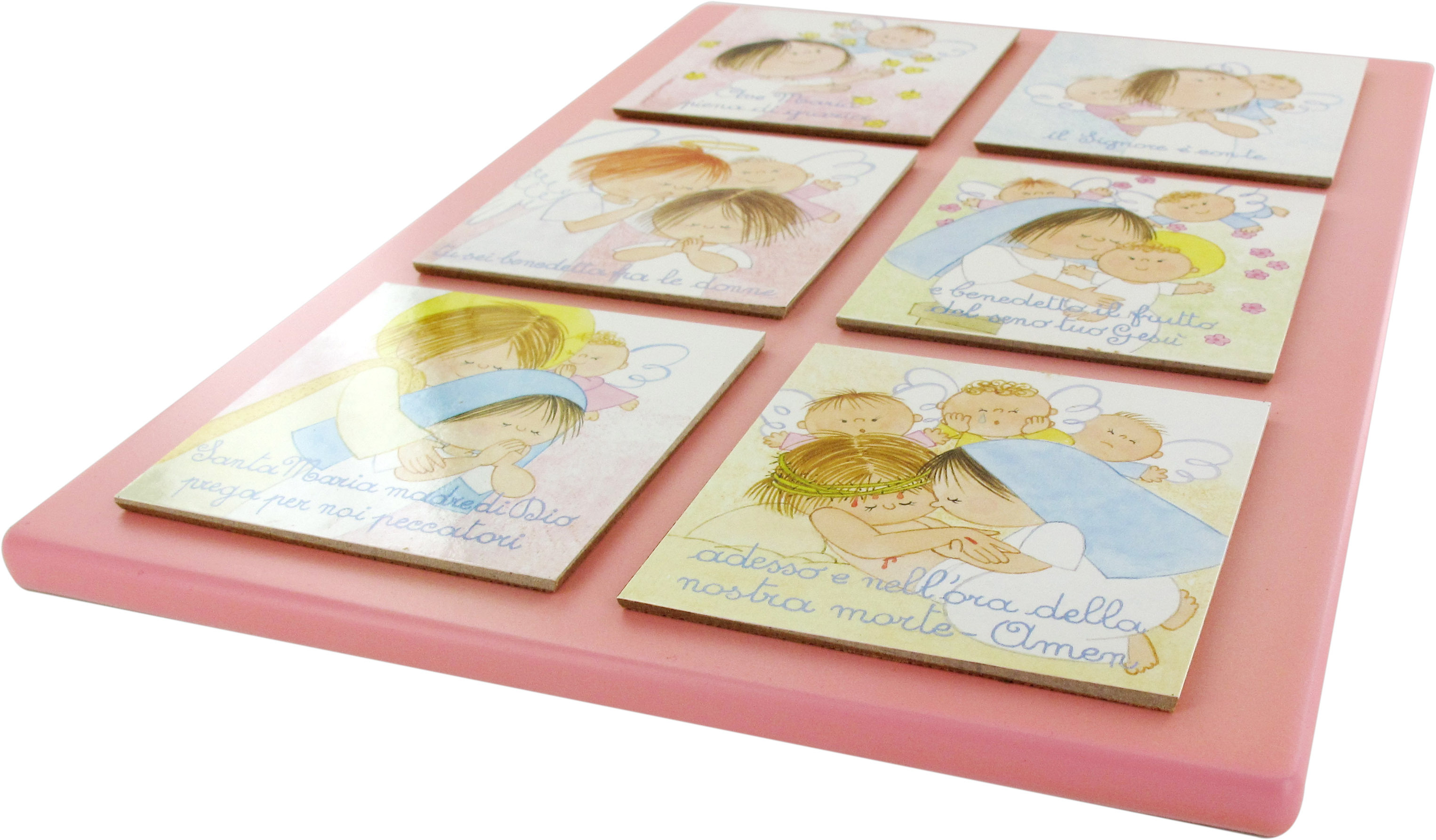 Tavola con l'Ave Maria con 6 riquadri in legno colorato rosa. Dimensioni: 29 x 21 cm.
