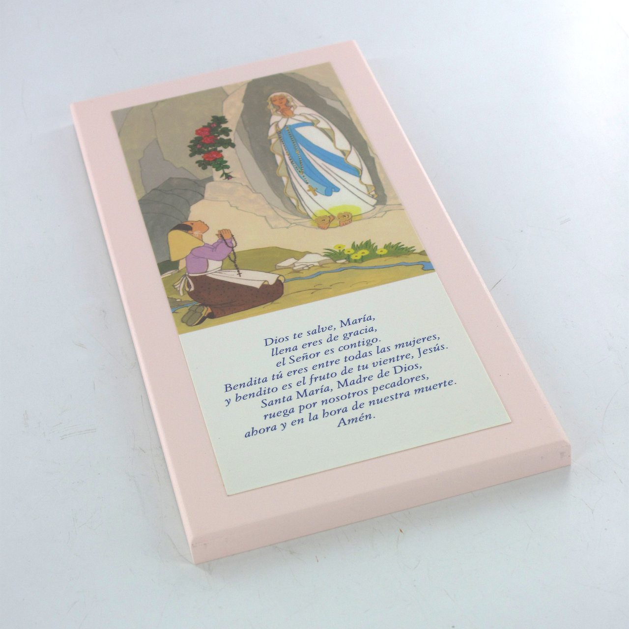 Tavola Lourdes con preghiera Ave Maria in spagnolo su legno rosa - 26 x 12,5 cm