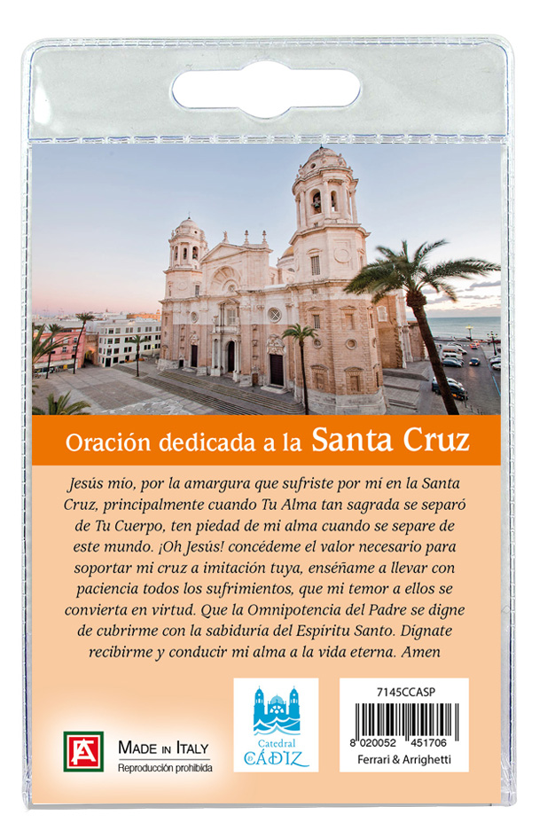 Calamita in metallo nichelato raffigurante la Catedral de Cadiz con una preghiera in spagnolo.