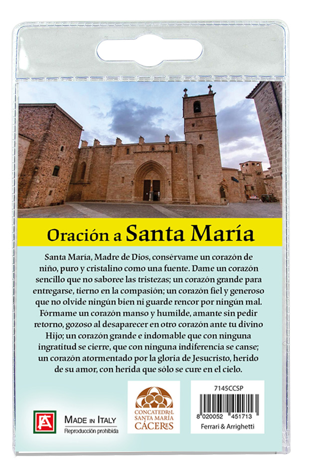 Calamita in metallo nichelato raffigurante la Concatedral de Caceres con una preghiera in spagnolo.
