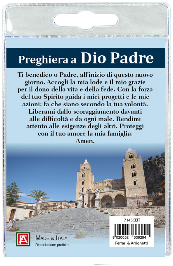Nell'interno del blister c'è anche un cartoncino con l'immagine del Cristo Pantocratore e sul retro del cartoncino stesso una preghiera dedicata a Dio Padre.