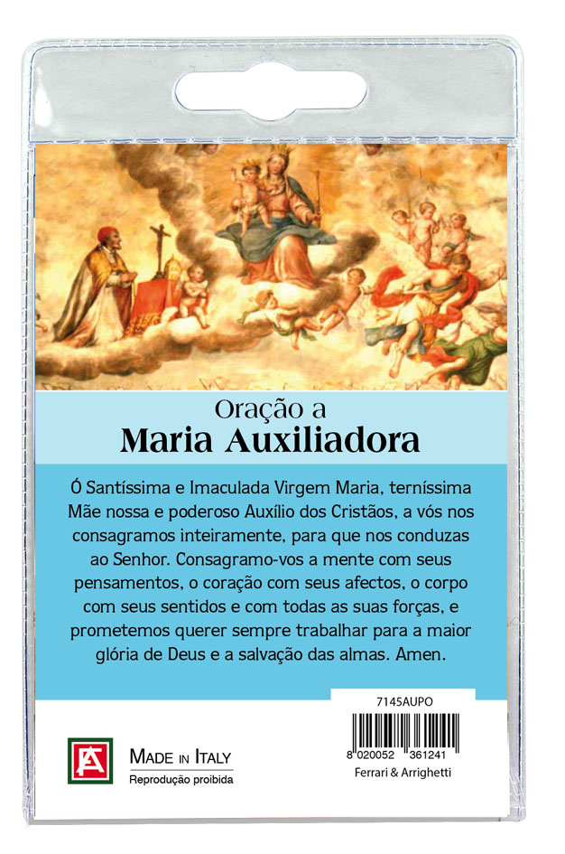 Calamita Madonna Ausiliatrice in metallo nichelato con preghiera in portoghese