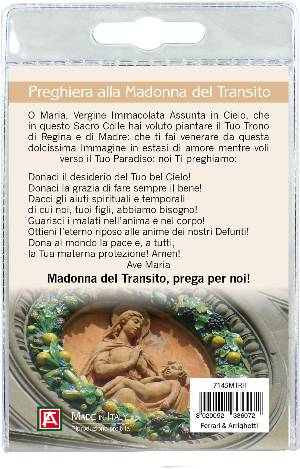 Calamita in metallo nichelato raffigurante la Madonna del Transito con preghiera in italiano.