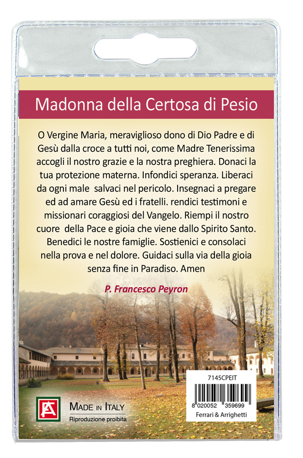 Nell'interno del blister c'è anche un cartoncino con l'immagine della Certosa di Pesio e sul retro del cartoncino stesso una preghiera a lei dedicata.