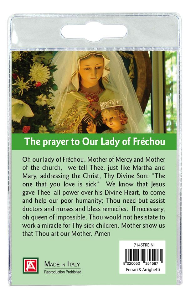 Calamita Madonna di Frechou in metallo nichelato con preghiera in inglese
