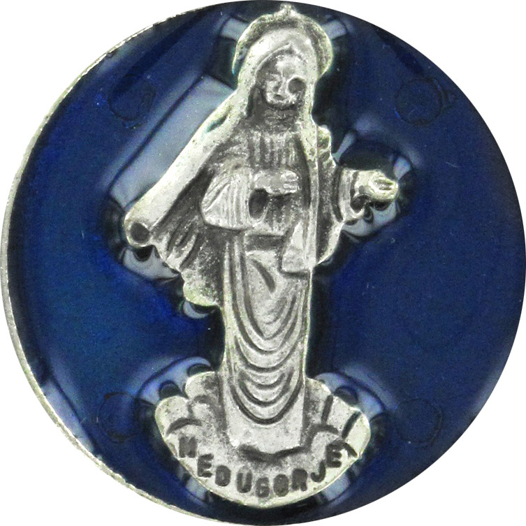 Calamita in metallo nichelato con forma ottagonale di cm. 4 con smalto blu che circonda la placchetta in metallo raffigurante la Madonna Medjugorje.