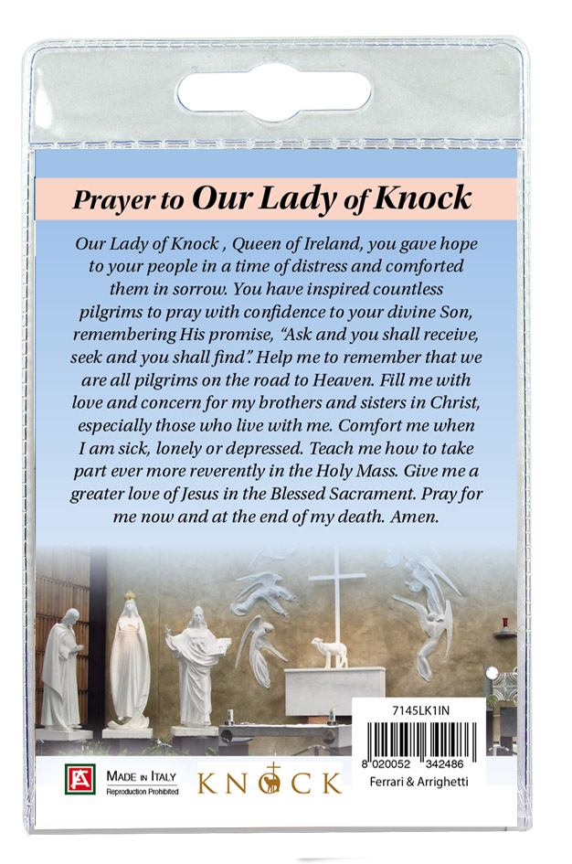Nell'interno del blister c'è anche un cartoncino con l'immagine del Santuario e sul retro del cartoncino stesso una preghiera dedicata a Our Lady of Knock.