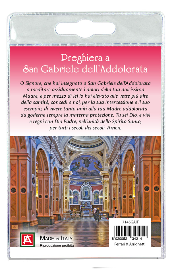 Calamita San Gabriele dell'Addolorata in metallo nichelato con preghiera in italiano
